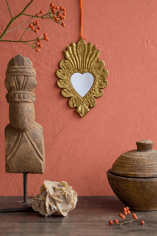 Brass Heart Mirror with Embossed Flame Design