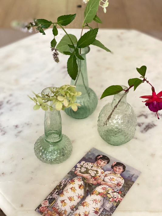 Elke vaas is handgeblazen van gerecycled glas en draagt de kleine handsporen van de maker. De zachte kleuren en organische vormen maken ze gemakkelijk overal neer te zetten, met bloemen, takken of gewoon zo.