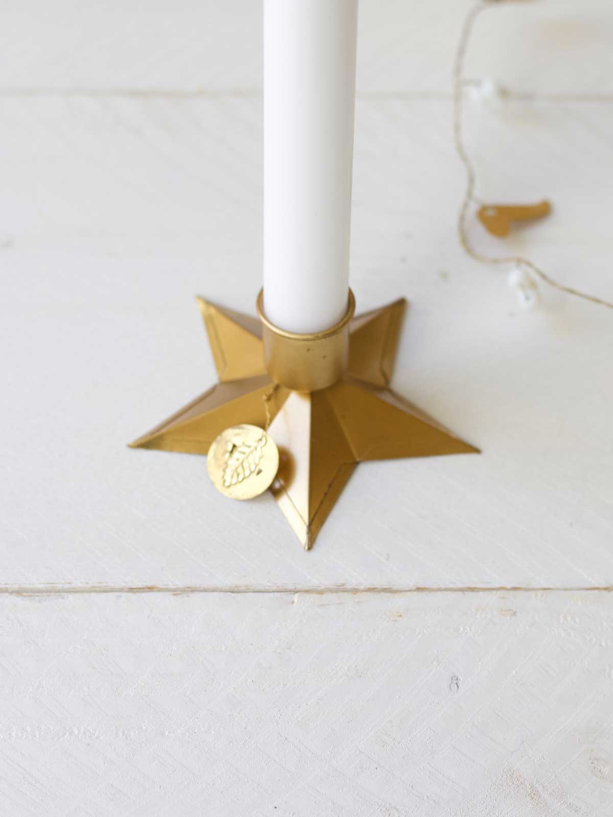 Een eenvoudige maar opvallende messing kandelaar in de vorm van een ster. Handgemaakt met een warme, goudkleurige afwerking die het zachte kaarslicht prachtig reflecteert. Perfect voor feestelijke gelegenheden of als subtiel accent op een eettafel, tijdloos, robuust en vol charme.