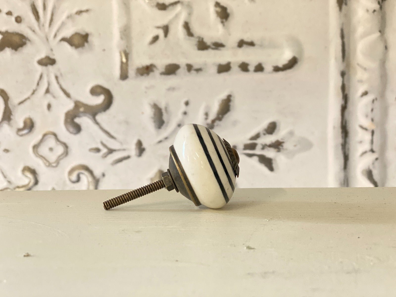 De zwarte ringen vormen een duidelijk focuspunt zonder het geheel visueel te verzwaren. Op een eenvoudige kast geven ze structuur. Op donkerder hout vallen ze net genoeg op. Het patroon is simpel, maar weloverwogen.