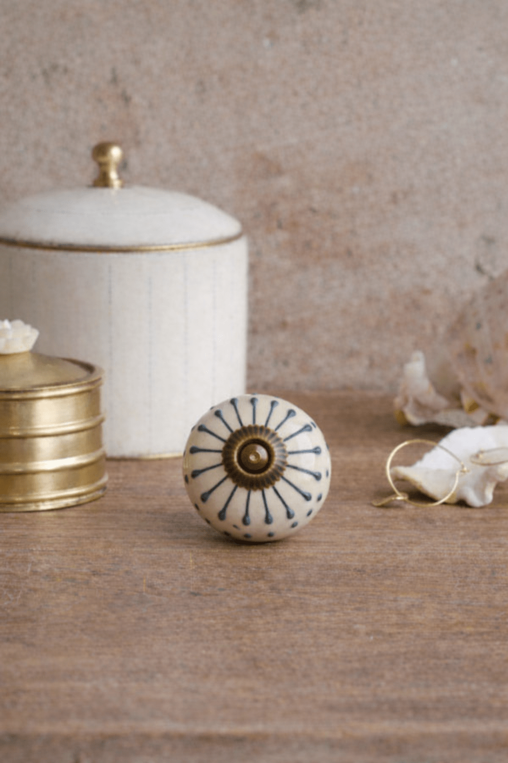 De ronde vorm ligt stevig in de hand. Het glazuur is glad, met subtiele kleurnuances in zowel het wit als het blauw, waardoor elk stuk net iets anders is. Het antieke messing middenstuk voegt warmte toe en verzacht de koele tinten.