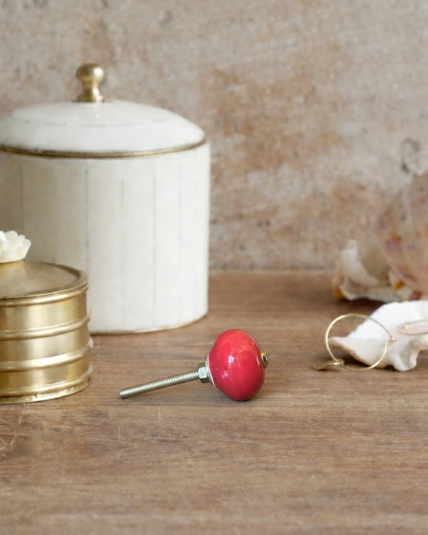 Deze keramische knop combineert een gladde, bolvormige vorm met een warme, okerrode glazuurlaag. Zonder reliëf of patroon is de kleur bepalend voor het ontwerp. Het glanzende oppervlak geeft diepte, terwijl de ronde vorm het geheel in balans houdt.