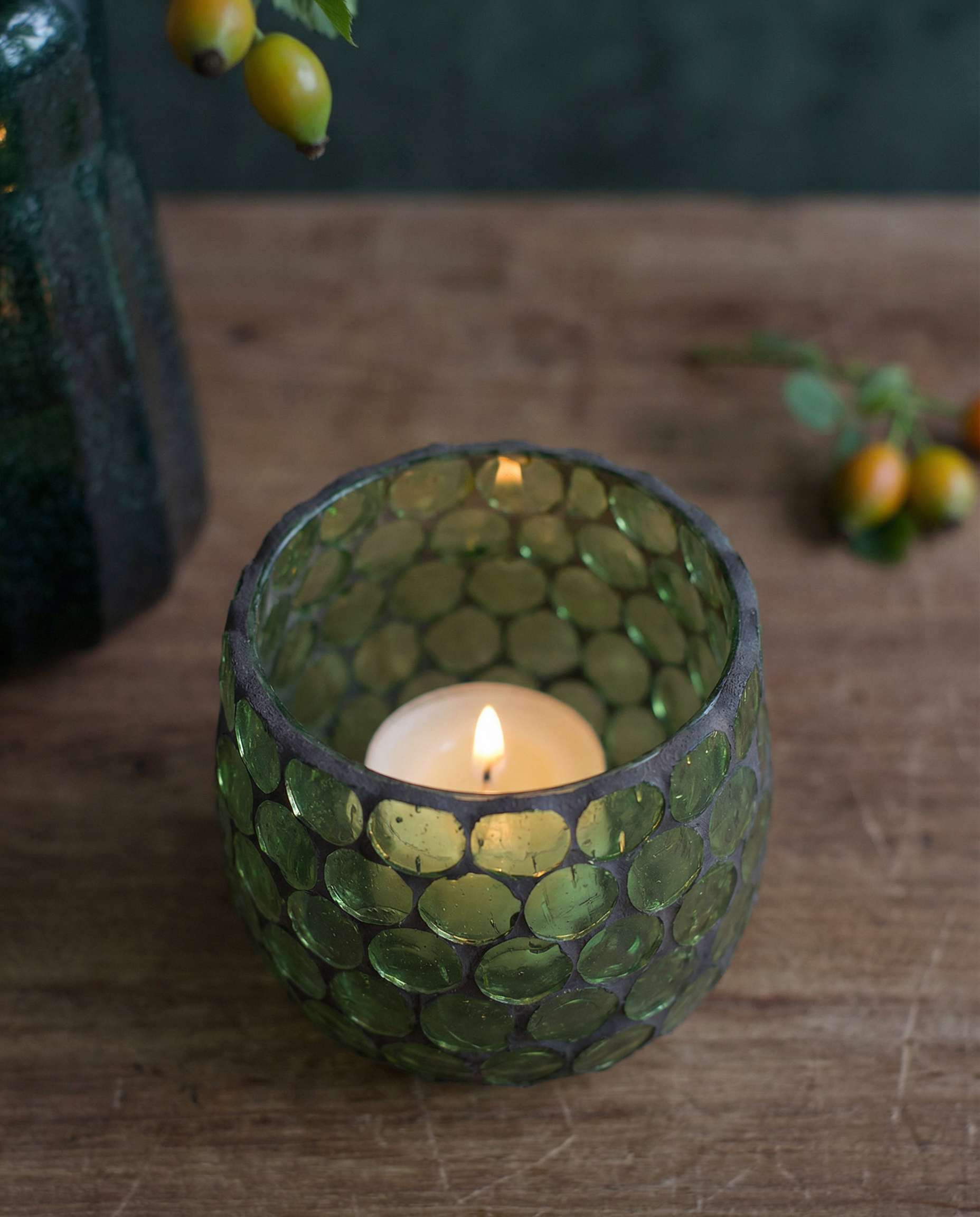 Deze handgemaakte theelichthouder van gerecycled glas heeft een zachte, ronde vorm en een mozaïekpatroon dat tot leven komt in het kaarslicht. Elk exemplaar is uniek, met subtiele variaties die het ambacht van de maker laten zien. Perfect om een warme, intieme sfeer te creëren op de eettafel, het dressoir of in de vensterbank. Prachtig op zichzelf, maar ook sfeervol in combinatie met andere kaarsenhouders.