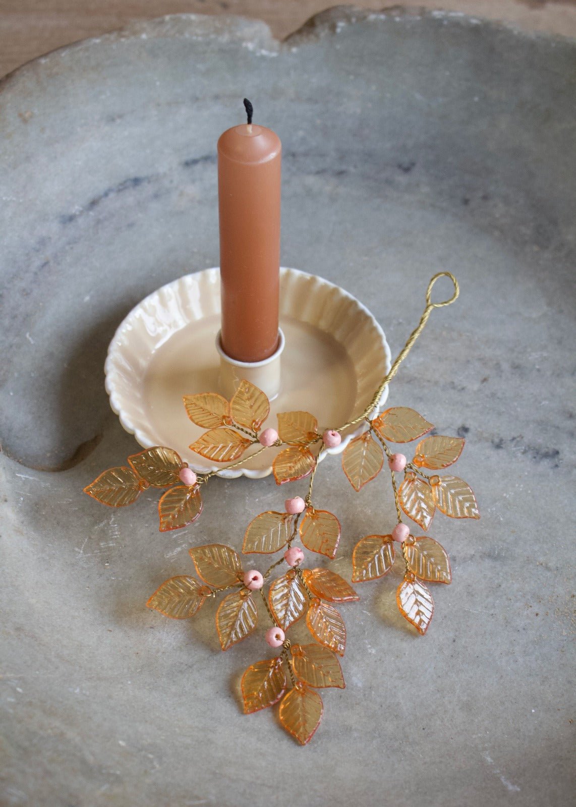 Delicaat en poëtisch, dit handgemaakte ornament legt de stille schoonheid van de natuur vast in haar meest gracieuze vorm. Elke tak is zorgvuldig gedraaid van fijn goudkleurig draad, met doorschijnende blaadjes die zachtjes glinsteren in het licht. Kleine roze kraaltjes rusten als besjes tussen het gebladerte en voegen een subtiele toets van kleur en charme toe. Hangend aan een warm fluwelen lint, brengt het een subtiele sfeer van romantiek en nostalgie, perfect om een schouw, raam of feesttafel te versieren. Elk stuk is enigszins uniek, met de hand vervaardigd om imperfectie en authenticiteit te vieren.