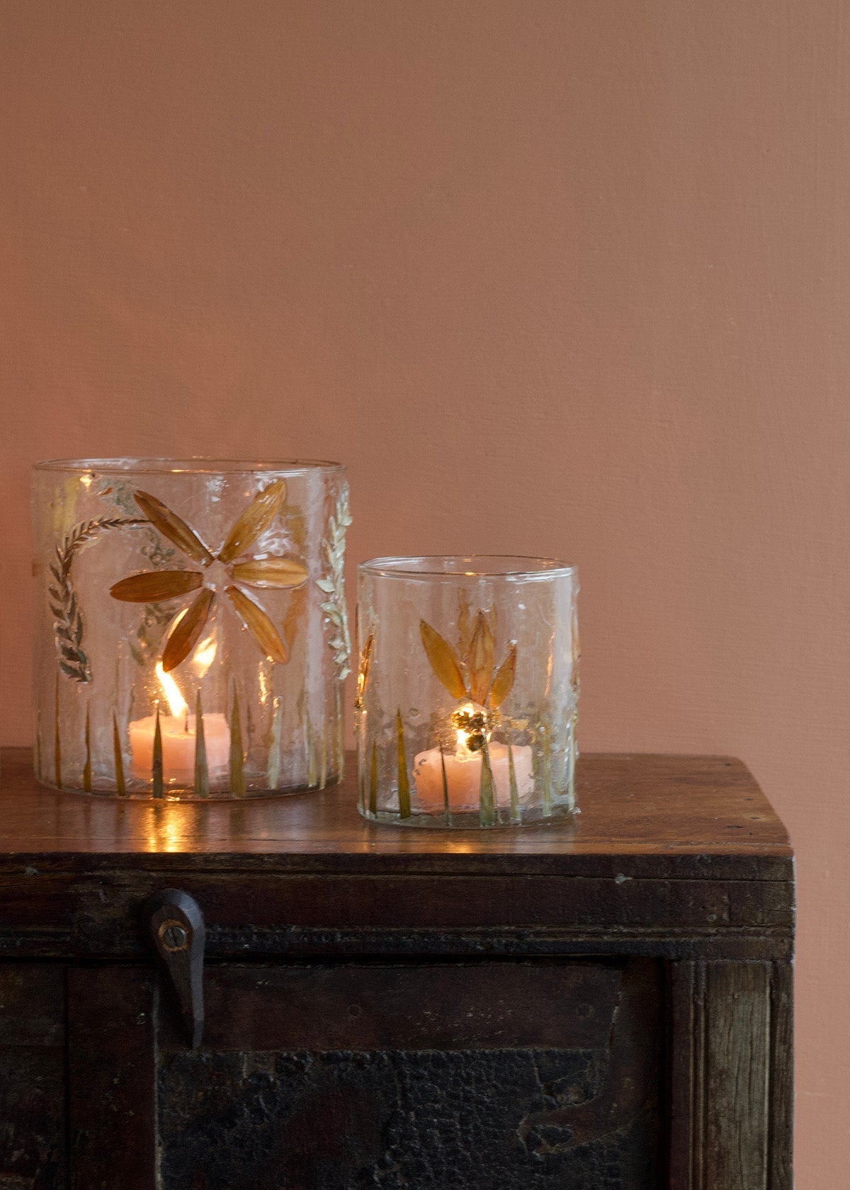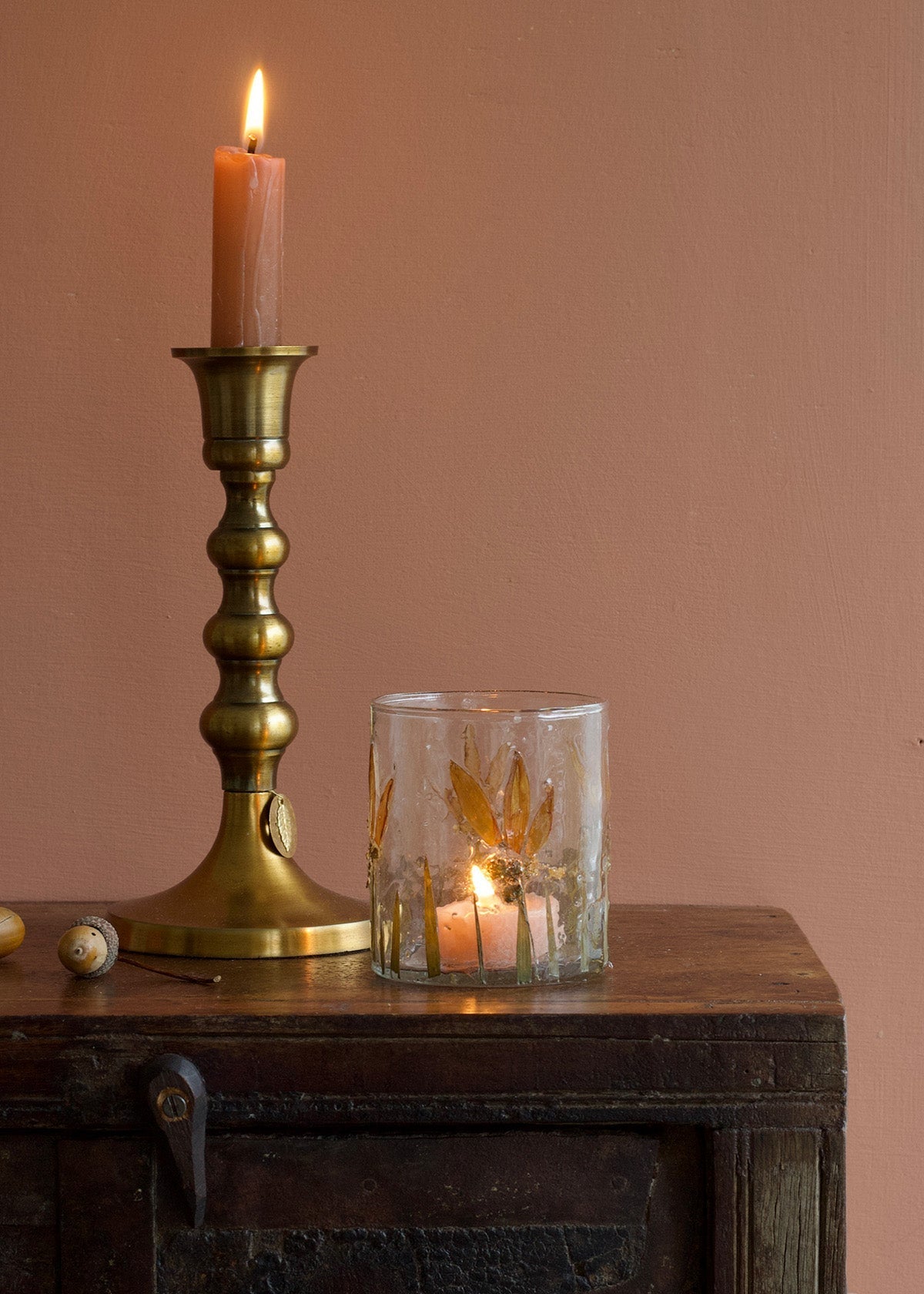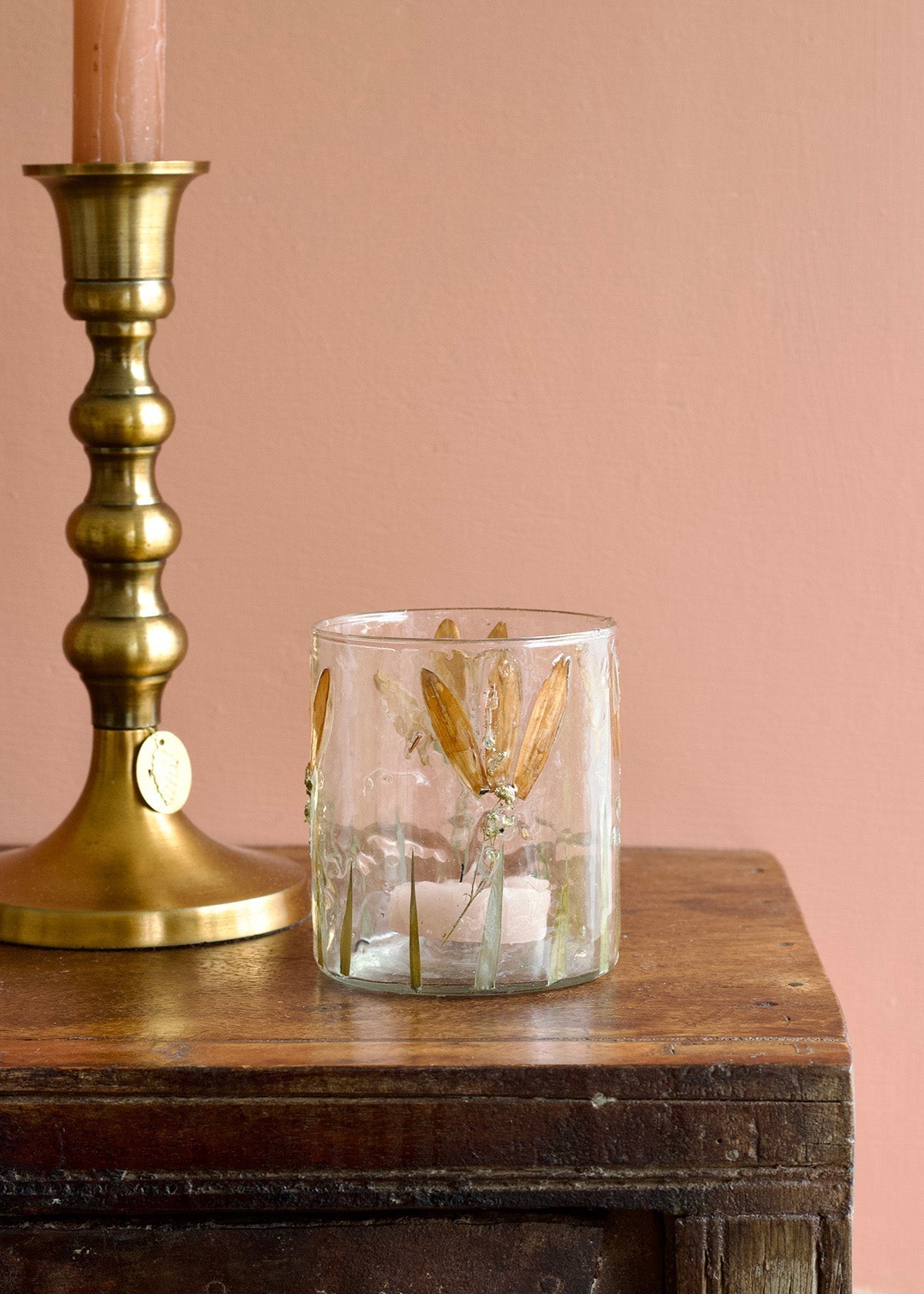 Deze kleinere tealighthouder geeft een zacht en ingetogen licht. Het kaarsje staat dicht bij het glas en de gedroogde bloemen blijven zichtbaar zonder op de voorgrond te treden. Het licht is rustig en blijft dichtbij het oppervlak waarop hij staat.