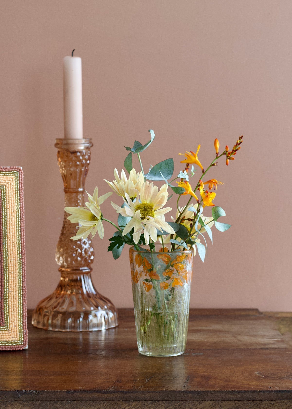Deze hoge theelichthouder geeft een warm licht dat omhoog stijgt in plaats van zich te verspreiden. De kaars zit dieper in het glas en de gedroogde bloemen lijken in lagen te liggen, omhoog bewegend langs het oppervlak. De vlam voelt beschermd aan, waardoor een kalme, constante gloed ontstaat.