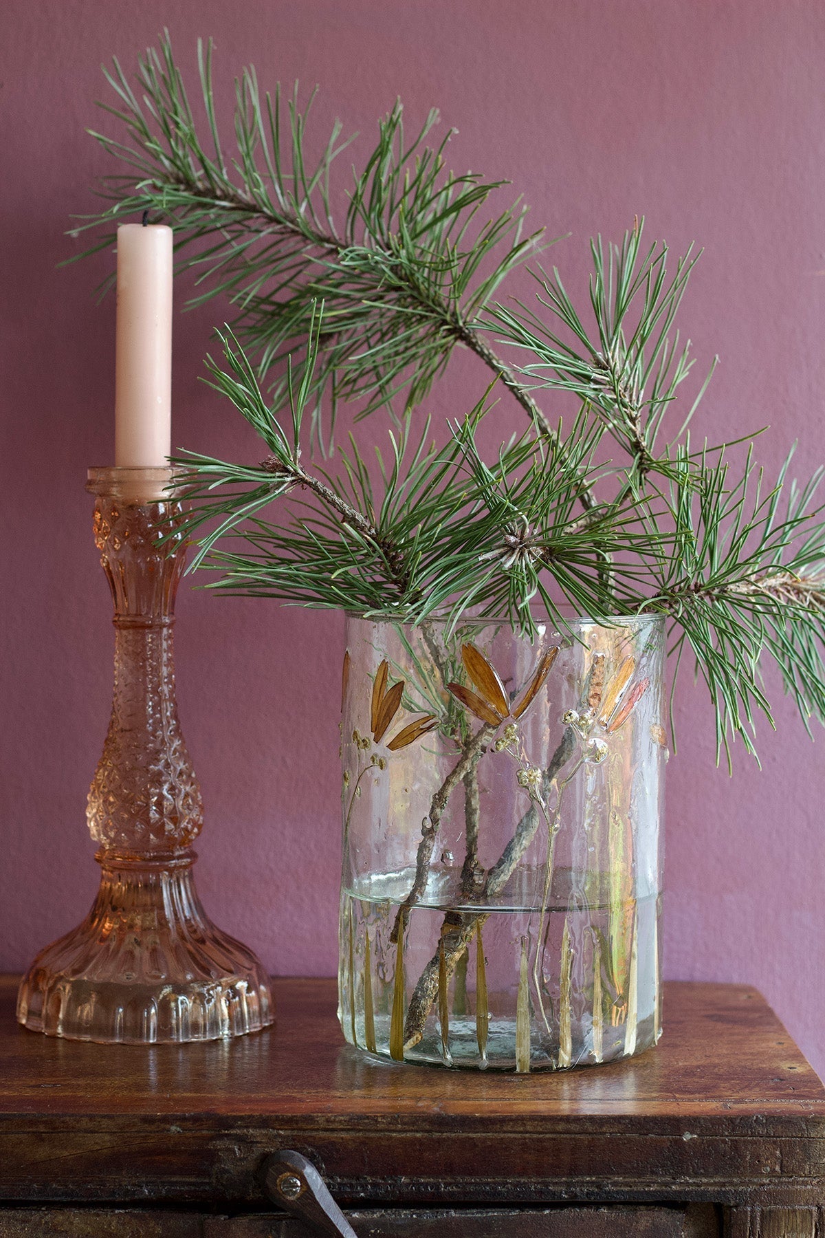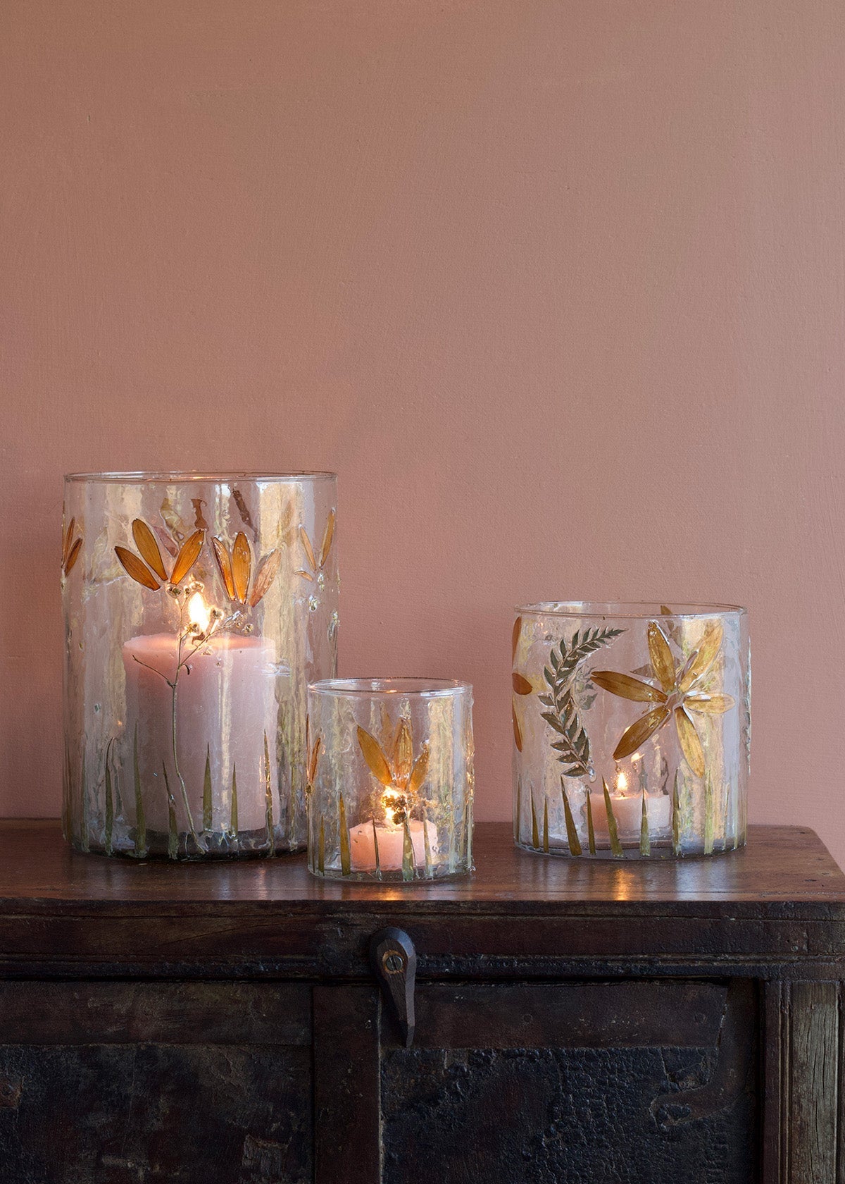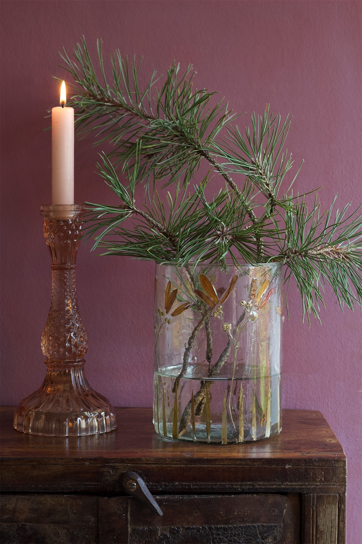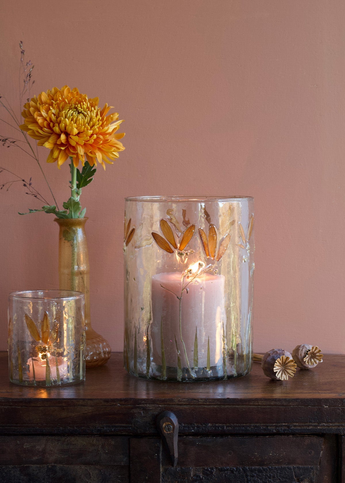 Hij komt goed tot zijn recht op een dressoir, lage kast of als middelpunt op tafel. Vooral ’s avonds zorgt hij voor warmte zonder de sfeer te veranderen. Elke houder heeft zijn eigen samenstelling van echte gedroogde bloemen, vanzelf opgenomen in het glas. Die kleine verschillen geven het object karakter en laten het vanzelfsprekend aanvoelen.