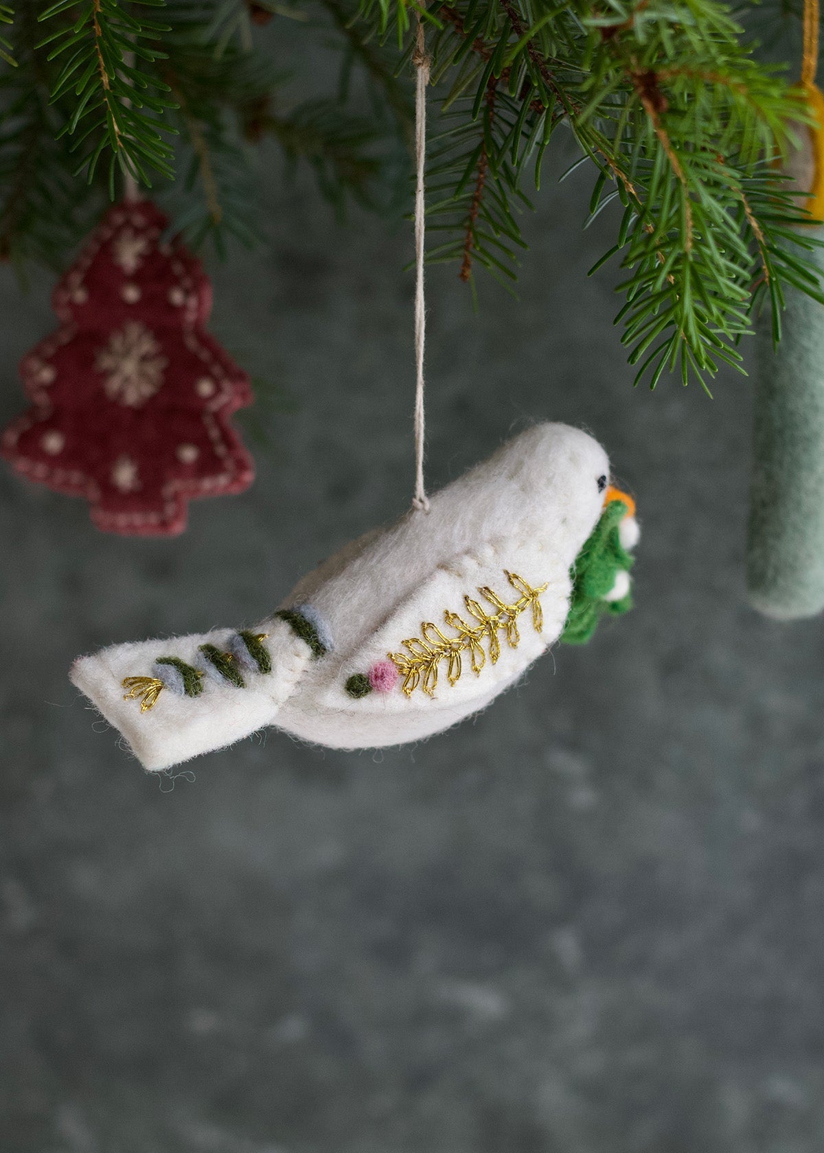 Breng vrede en een vrolijke sfeer in je kerstboom met deze handgemaakte witte vilten duif. In veel culturen staat de duif symbool voor liefde, hoop en vrede, waardoor het een betekenisvolle decoratie is voor de feestdagen. Handgemaakt van zacht wolvilt met delicaat goudkleurig borduurwerk en een klein takje groen, voelt het als een kleine boodschapper van goede wil. Perfect voor het creëren van een boom die persoonlijk, warm en karaktervol aanvoelt.