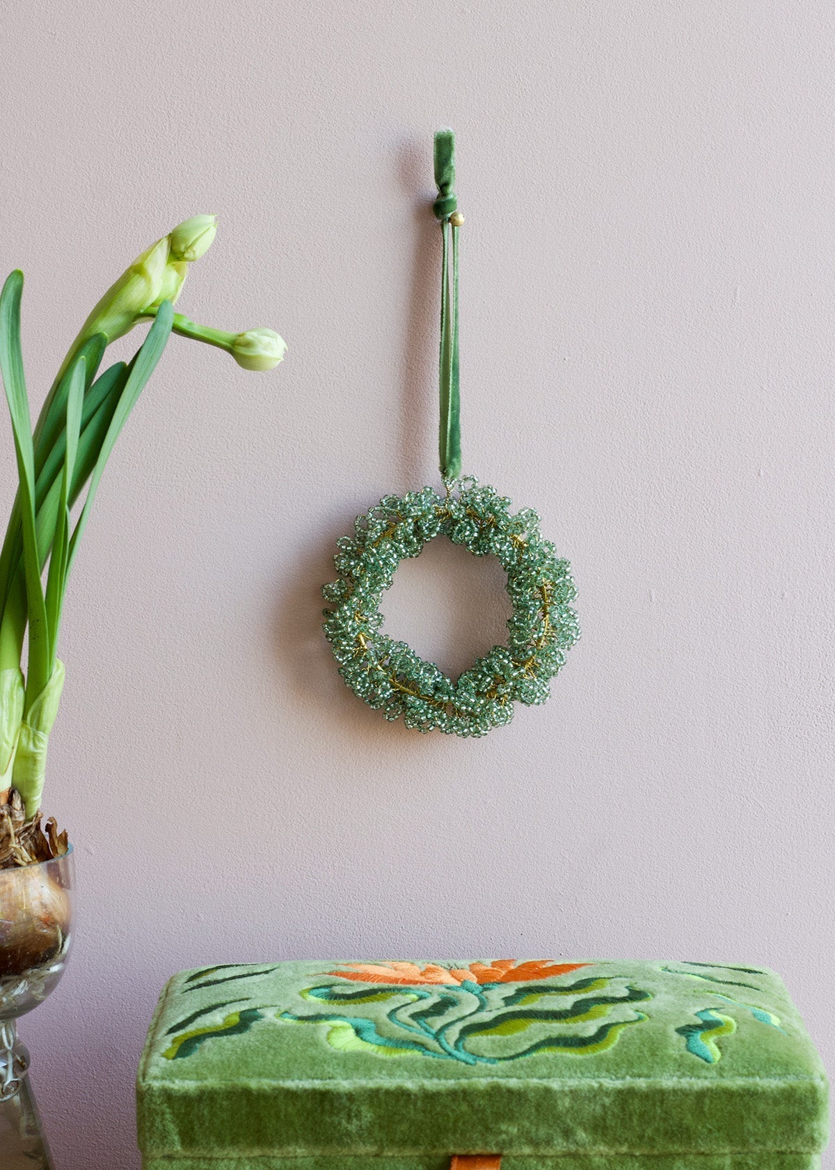 This handmade wreath adds a quiet detail to the wall. The dense ring of glass beads creates a soft texture that catches the light in subtle points. Hung on a narrow ribbon, it brings a gentle accent without taking much space.