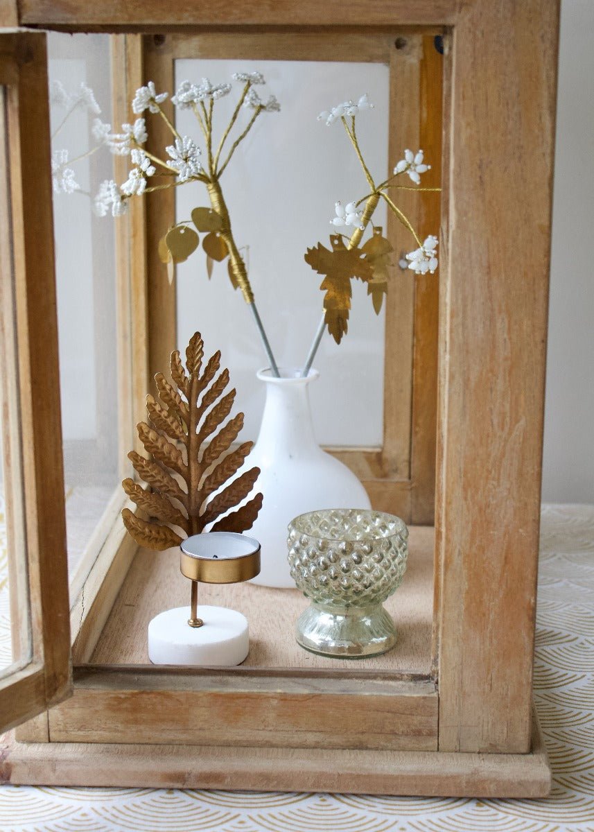 Beautiful handmade brass flower ornament, decorated with white beads and brass-coloured leaves.