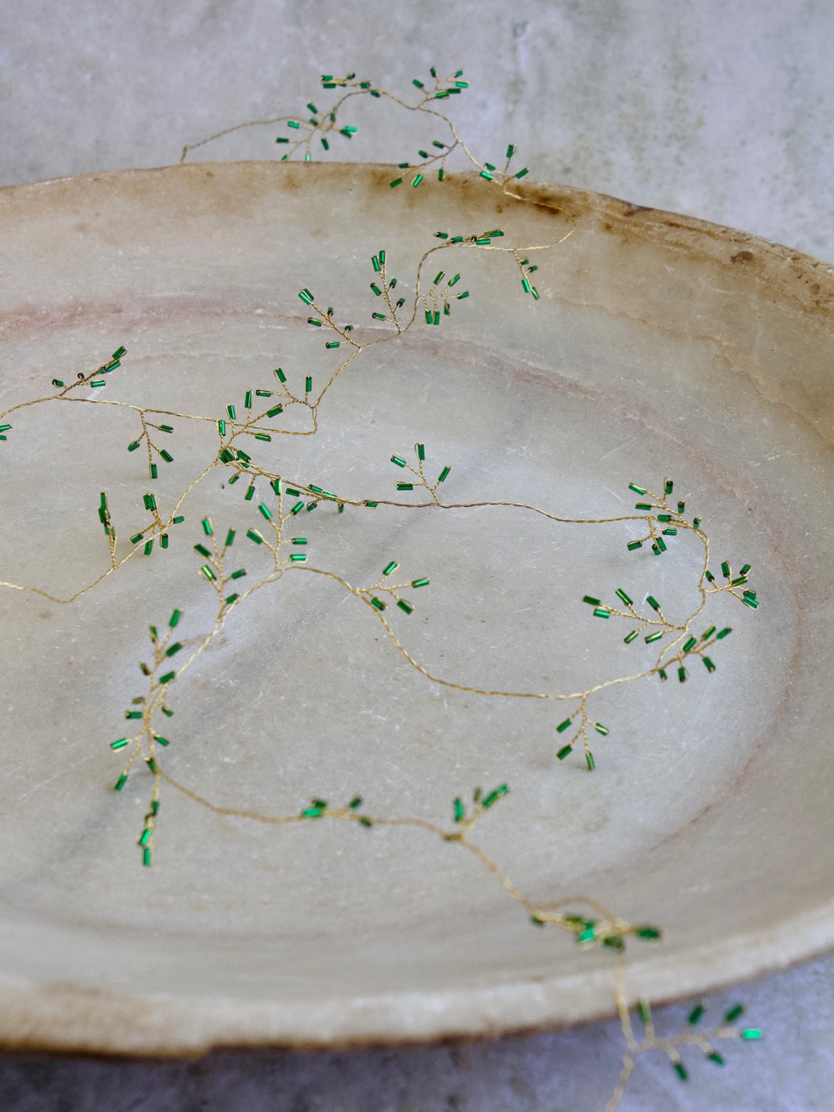 Enhance your decor with this decorative gold-colored garland, featuring small artificial jade green beads. Handmade from brass, it adds a touch of elegance and natural beauty.