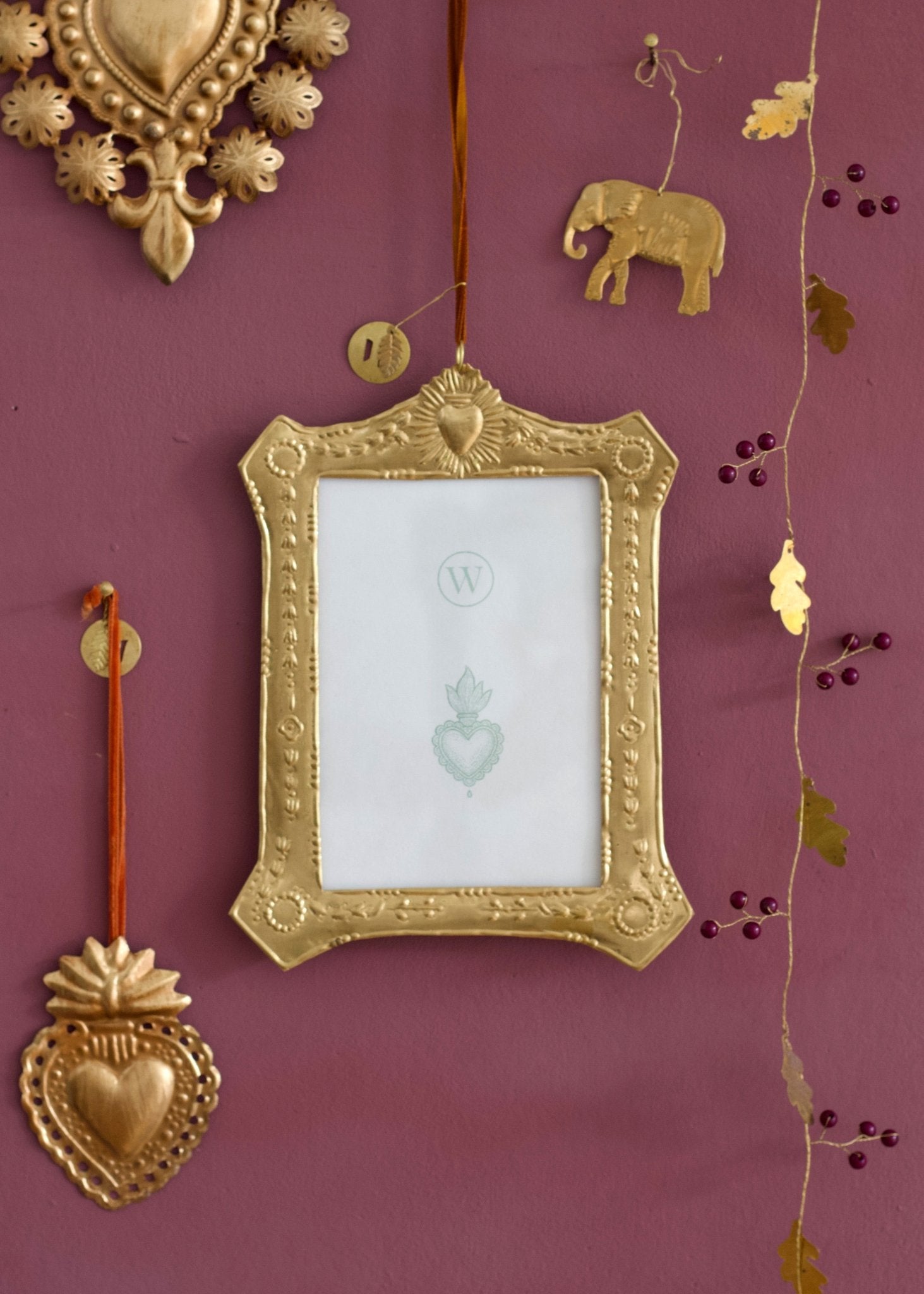 This large gold frame combines the warmth of craftsmanship with the charm of vintage devotion pieces. Inspired by traditional ex-voto art, it features embossed floral patterns and a raised heart at the top, adding character and texture to your wall. The hand-finished brass has a soft antique sheen that makes each piece slightly unique. Perfect for displaying a photograph, small artwork, or pressed flower, this frame turns any image into something more personal and soulful. Beautiful on its own or as part of a wall display with other brass ornaments.
