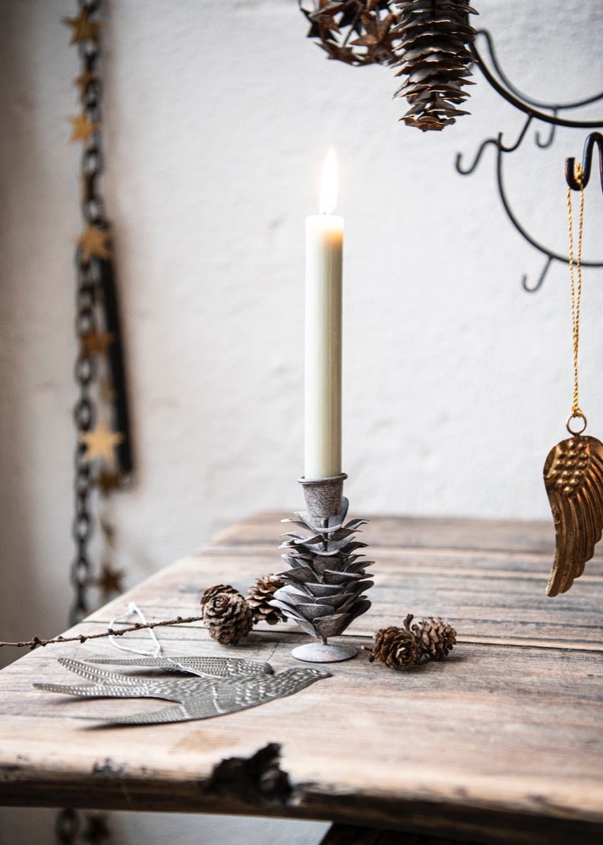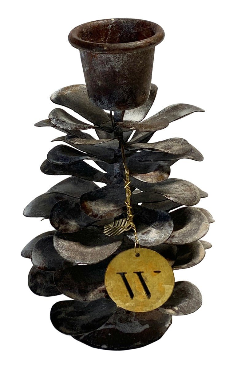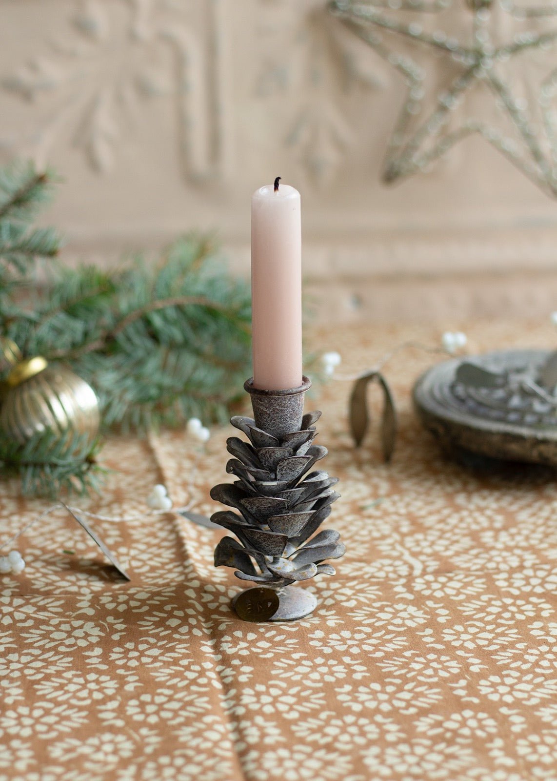 This handcrafted metal candle holder features a pinecone design with an antique zinc finish. Sized to hold dinner candles, it combines rustic charm with expert craftsmanship.