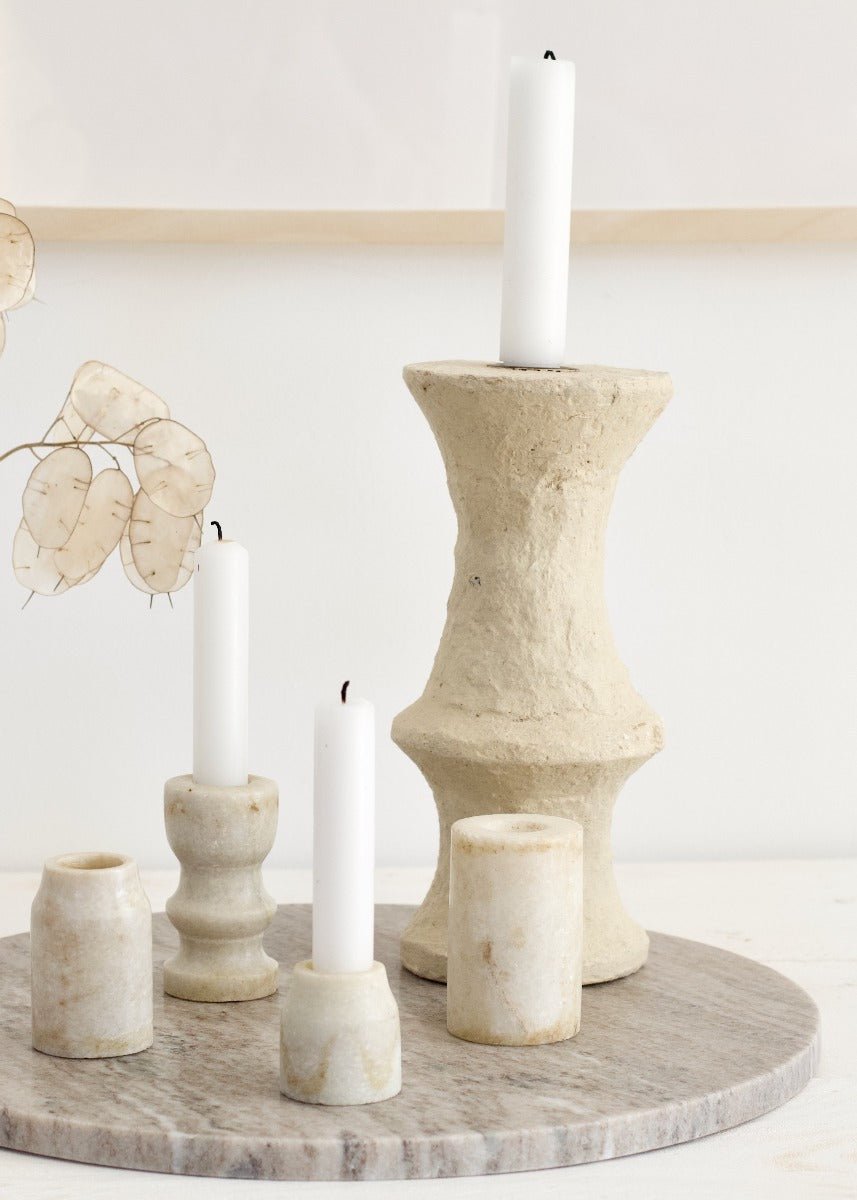 This tall paper mâché candle holder is a quiet statement piece that celebrates the beauty of imperfection. Handcrafted from recycled paper and natural paste, it has a sculptural silhouette that feels both organic and architectural. The matte, textured surface brings warmth and depth, making it a perfect accent for serene, nature-inspired interiors.