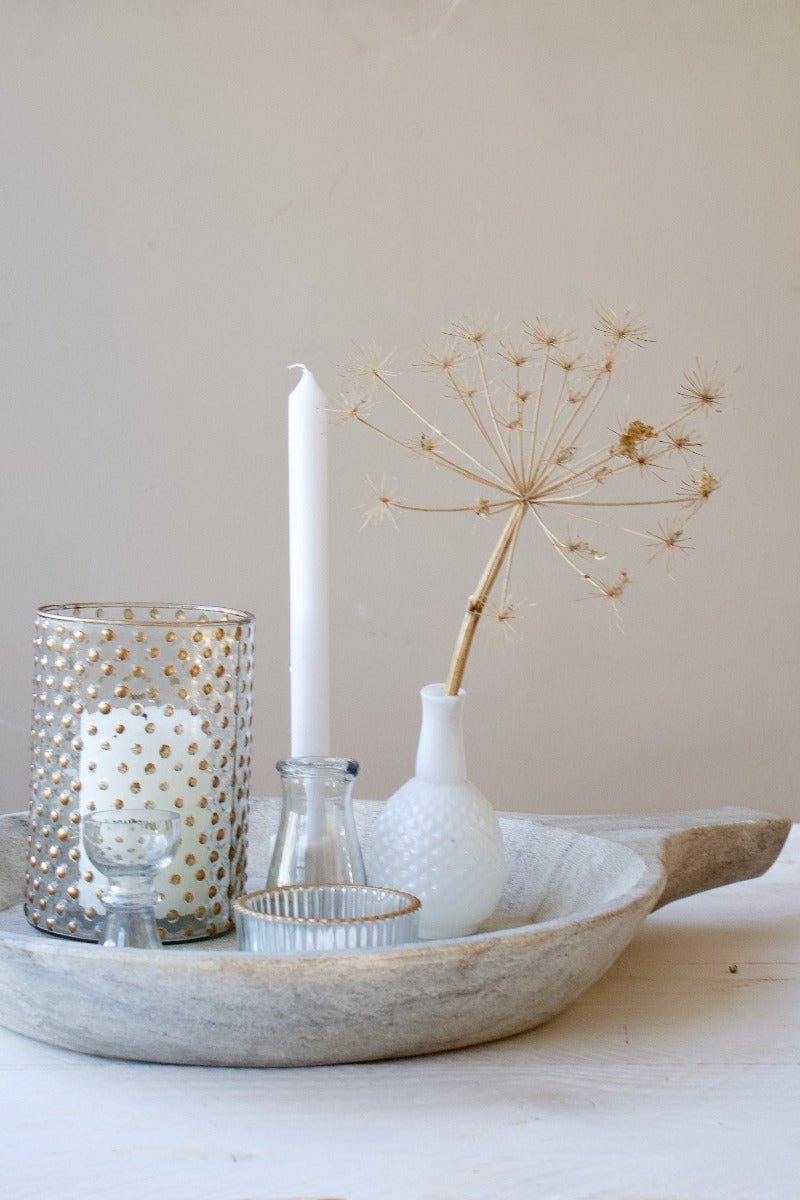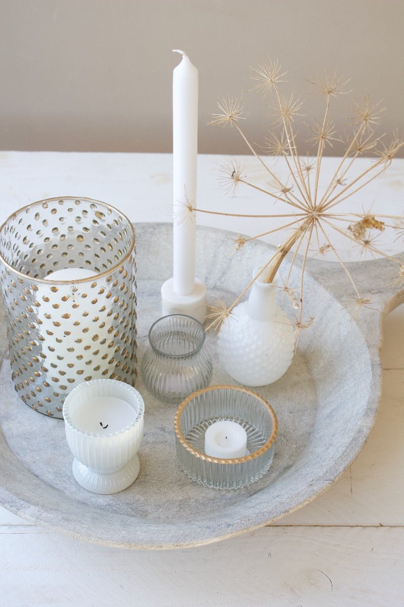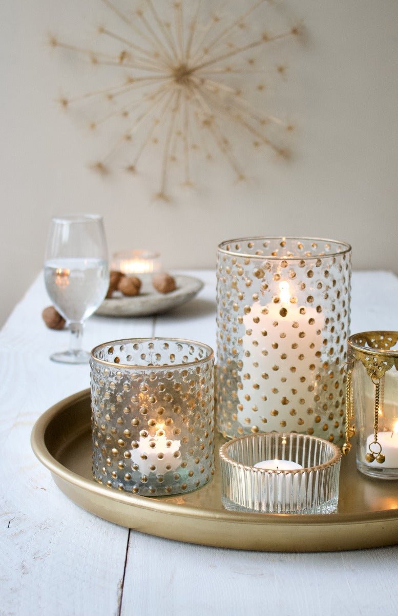 This large tealight holder is expertly handcrafted from glass, featuring meticulously handpainted golden dots and a refined gold-colored rim. Its elegant design adds a sophisticated touch to any setting, creating a warm, inviting ambiance while showcasing artisanal quality and attention to detail. Ideal for enhancing your décor with subtle luxury.
