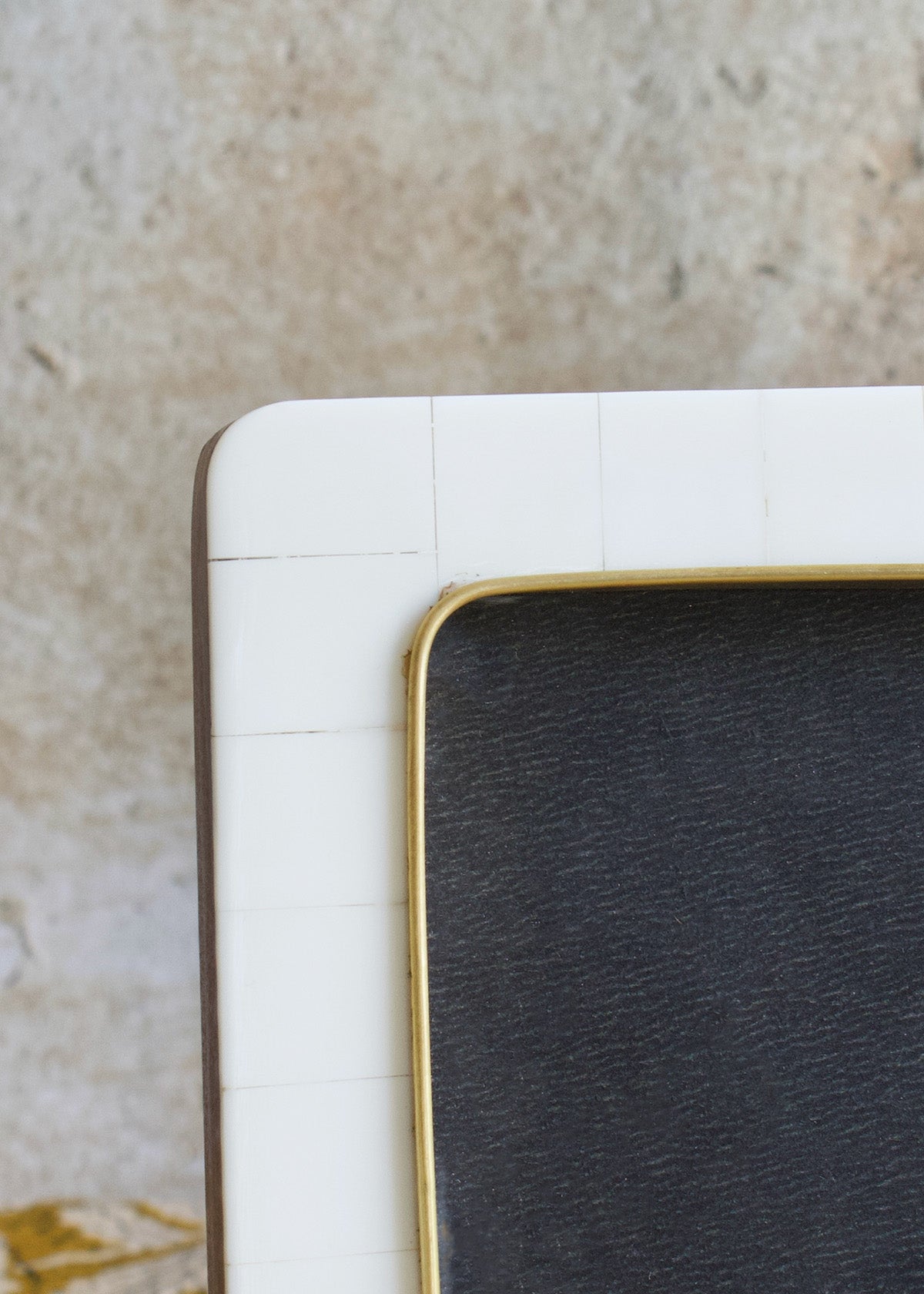 This photo frame is handmade with a smooth white surface and fine brass detailing around the inner edge. The clean lines and warm brass touch give it both a modern and timeless look.